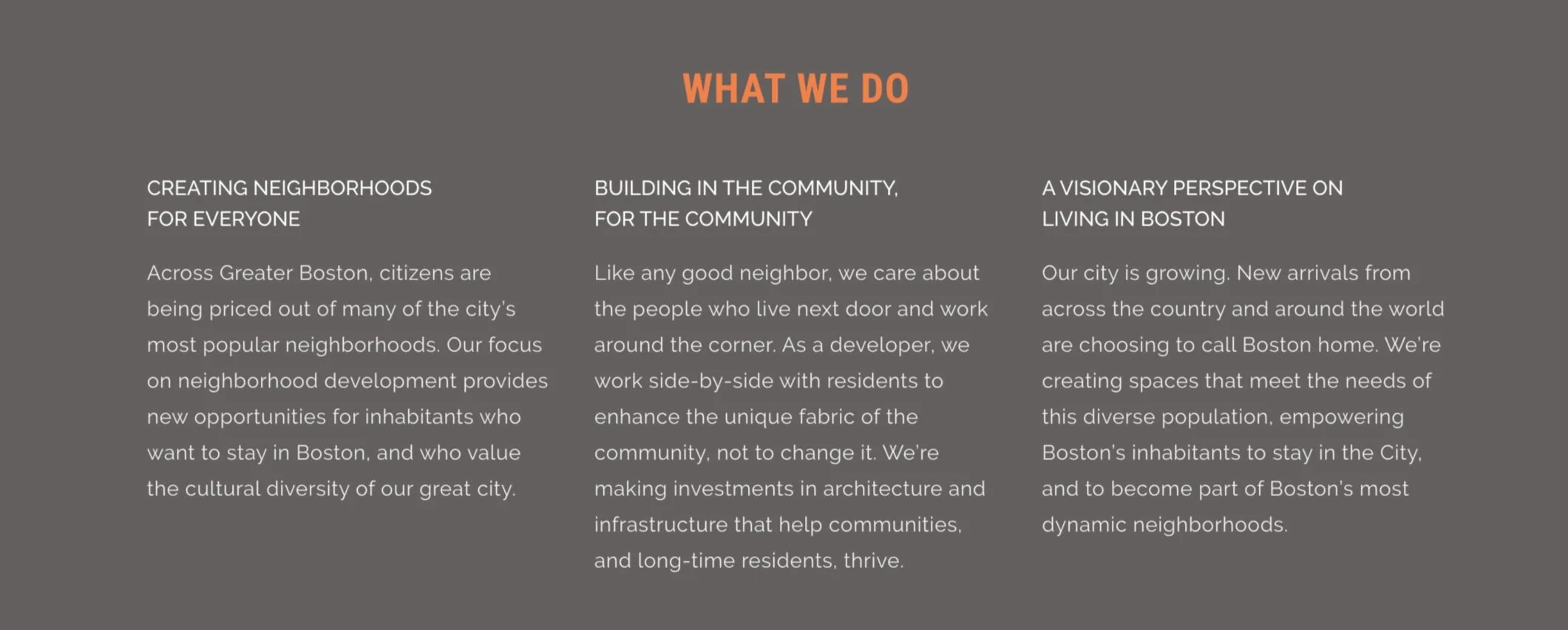 ”A point of origin is where new things begin. It’s the starting point of something great. At Origin Group, we believe that thoughtful, well-built properties have the power to strengthen communities and the people who live in them. Our buildings reflect the unique character of Boston’s neighborhoods and create a more dynamic city by making new living opportunities accessible to a wide variety of citizens. The spaces we create, and the close relationships we foster within our communities, are fueled by our belief that Boston should be one of the most dynamic and livable cities.”