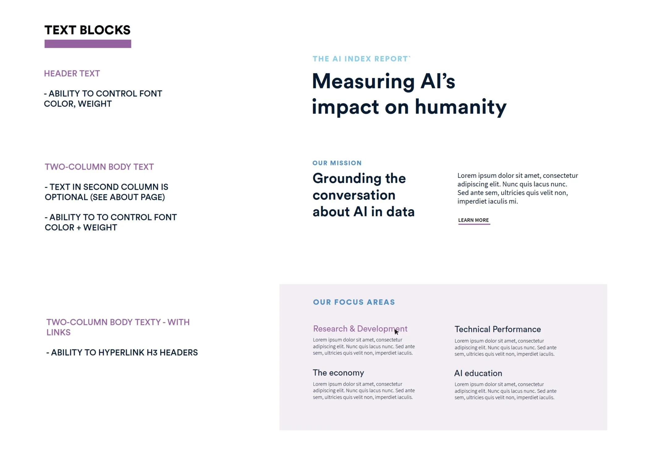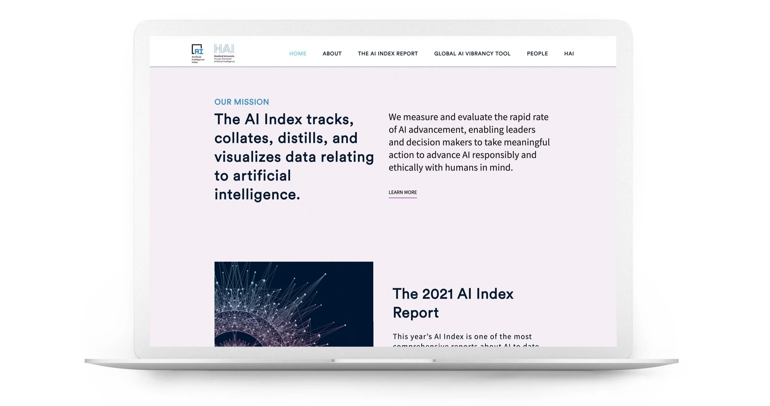 As a sub-division of Stanford’s Human-Centered Artificial Intelligence Lab (HAI), the AI Index was in need of a full-fledged website to help elevate the AI Index brand as a reputable measurement tool of AI progress that could begin to stand apart from the work being done by the Lab itself. But as the deadline for the 2021 report loomed, the launch of a companion website to unveil the report required a design direction and fast.