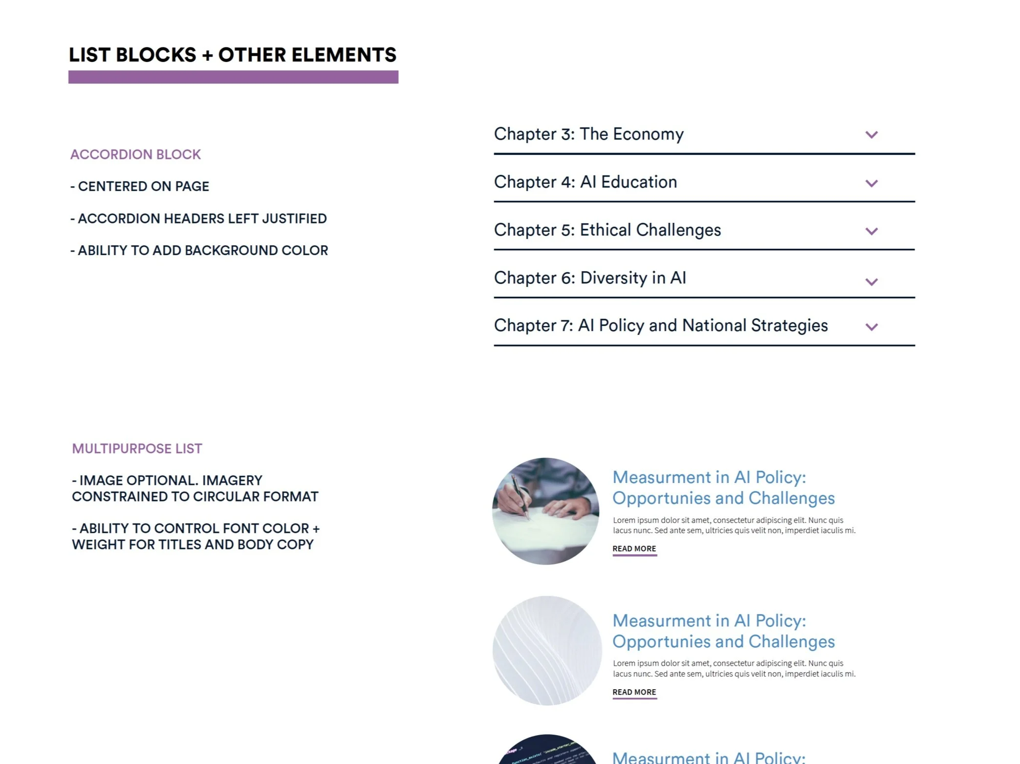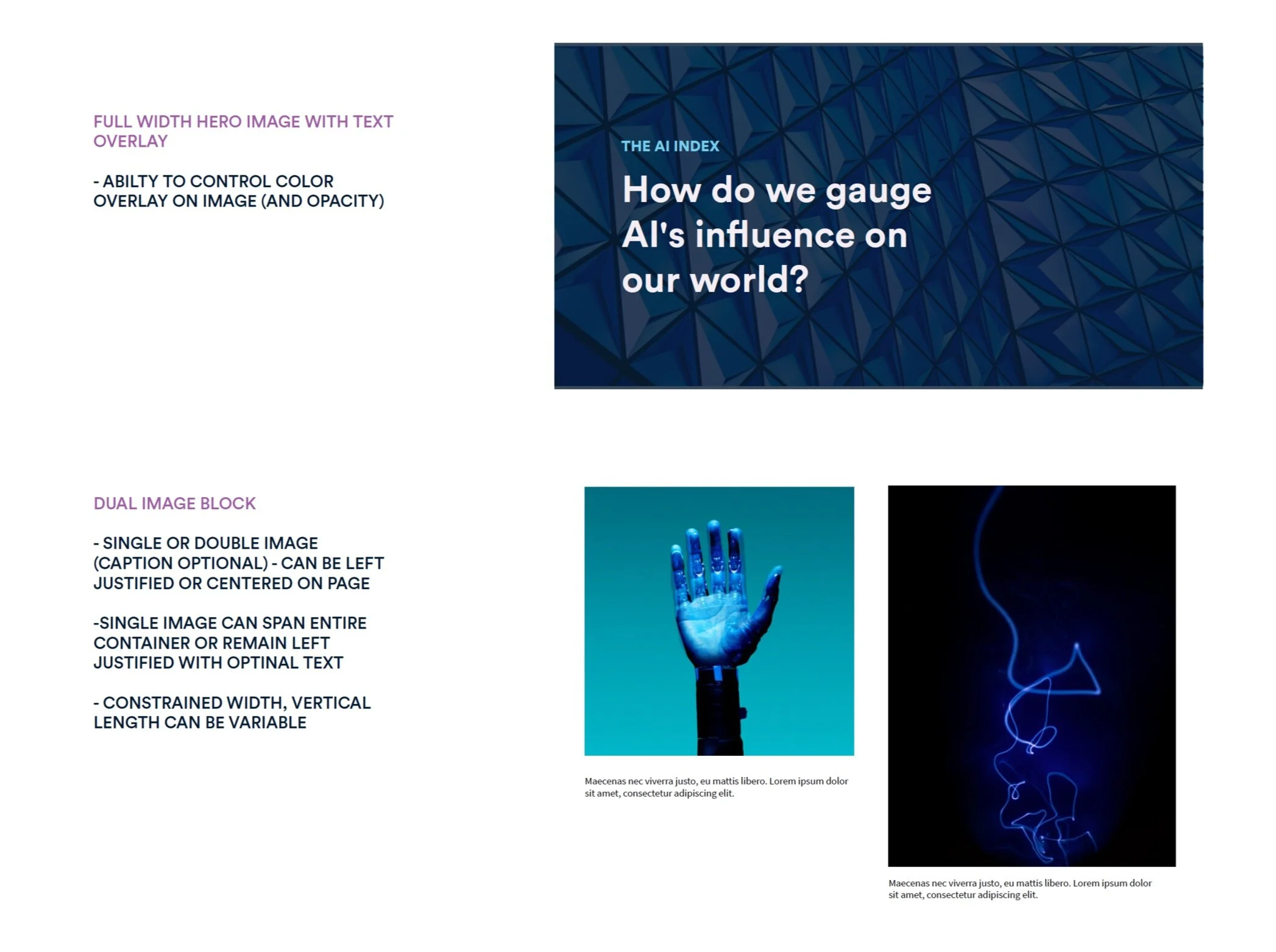 After meeting with the AI Index’s Research Manager to discuss his vision for the site and potential hurdles (we had an aggressive four-week timeline from design to development) I set about putting together visual designs and vector-based style guides that would enable their developers to move swiftly from development to launch.
